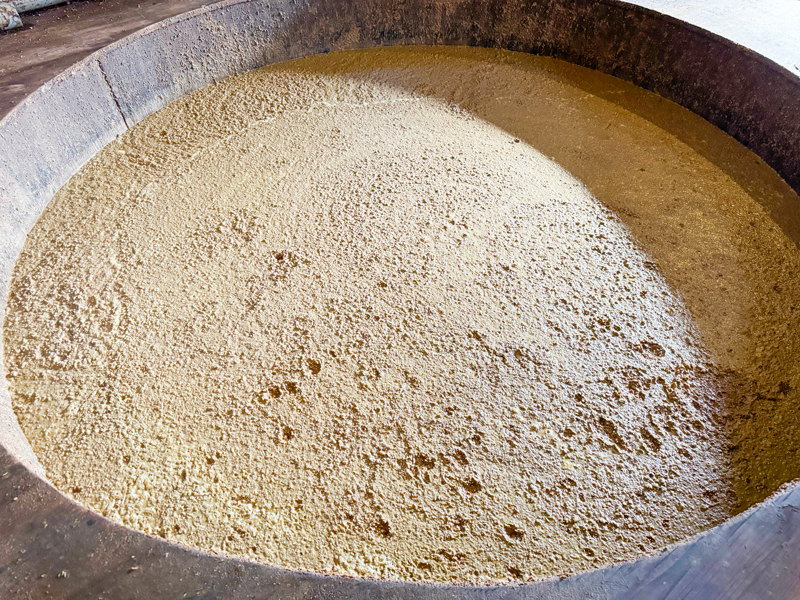 国産有機大豆をNK缶と呼ばれる巨大な圧力釜に入れて水とともに一晩寝かせます。翌日、油分と水抜き。次に内部を118度まで蒸し上げ、大豆を柔らかくしてたんぱく質の変化を促します。これにより酵素の作用を受けやすくします。