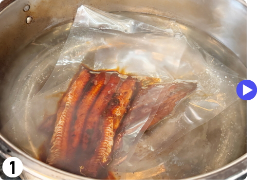 こちらは焼きがより強め。盛り付け後に秘伝の絶品うなぎタレをかけて、さっくりジューシーな食感が楽しめる長焼き用の蒲焼きです。